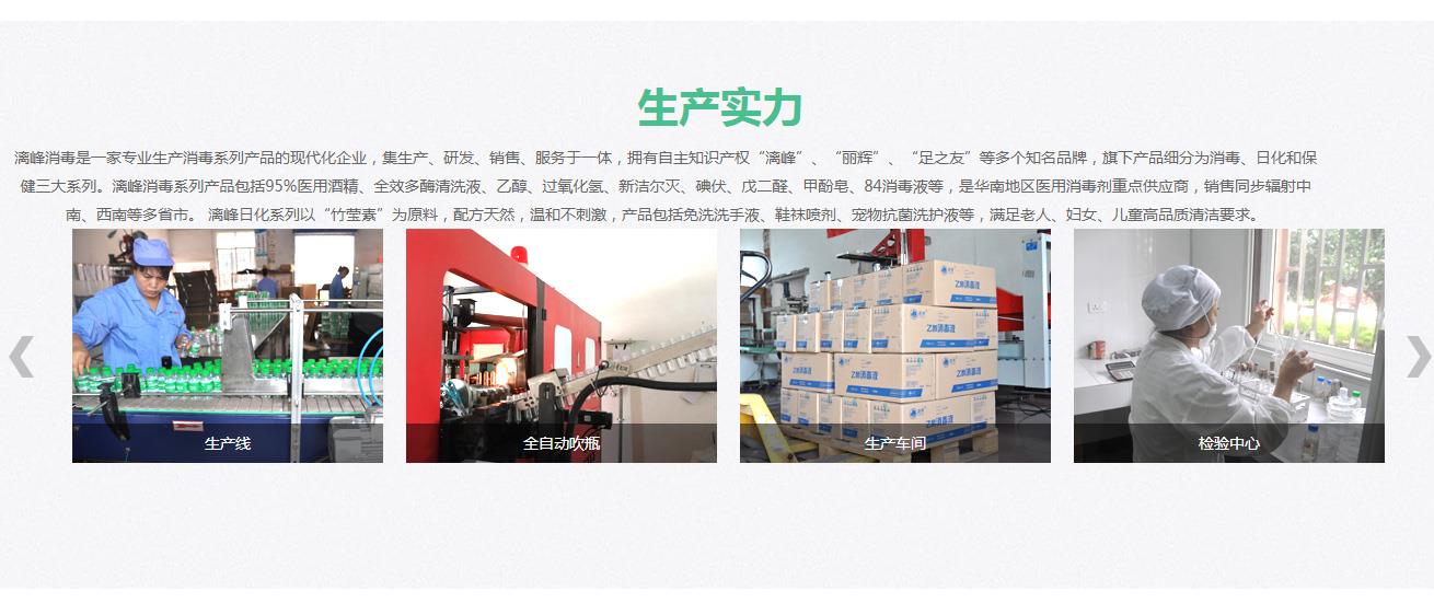 歷經十年發展,公司擁有自主知識產權“漓峰”、“麗輝”、“足之友”等多個知名品牌,旗下產品細分為消毒、日化和保健三大系列。公司榮獲2017年度廣東醫藥直銷商業聯盟榮和獎,是國內多家大型藥企戰略合作伙伴。 漓峰消毒系列產品包括95%醫用酒精、全效多酶清洗液、乙醇、過氧化氫、新潔爾滅、碘伏、戊二醛、甲酚皂、84消毒液等,是華南地區醫用消毒劑重點供應商,銷售同步輻射中南、西南等多省市。 漓峰日化系列以“竹瑩素”為原料,配方天然,溫和不刺激,產品包括免洗洗手液、鞋襪噴劑、寵物抗菌洗護液等,滿足老人、婦女、兒童高品質清潔要求。 漓峰保健系列擬研發消痛貼、消痛茶等多種類產品,精準切入痛風日常保健市場。 2018年,公司全面啟動“合伙人計劃”,誠邀各省市一二級代理商共同合作,以產品為載體,以用戶為中心,為用戶提供優質服務和升級體驗。