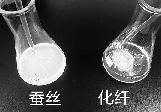 幾秒鐘后,浸有真蠶絲的消毒液顏色開(kāi)始變黃,再過(guò)十幾秒,蠶絲完全溶解消失,消毒液顏色變得更黃。相反,另一玻璃瓶里的小團(tuán)化纖,始終保持原樣,瓶中消毒液的顏色也沒(méi)有變化。