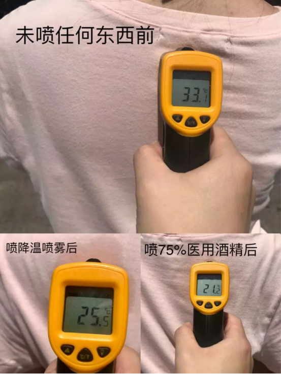 在陽光下,評果君用降溫噴霧和 75% 醫用級酒精噴劑,分別噴在評測員衣服的左、右兩側后(降溫噴霧不能直接噴在皮膚上哦 ~),立刻測溫度,噴了“網紅”降溫噴霧后,衣服立刻降了 7.6 ℃,四舍五入也算是降了接近 10 ℃
