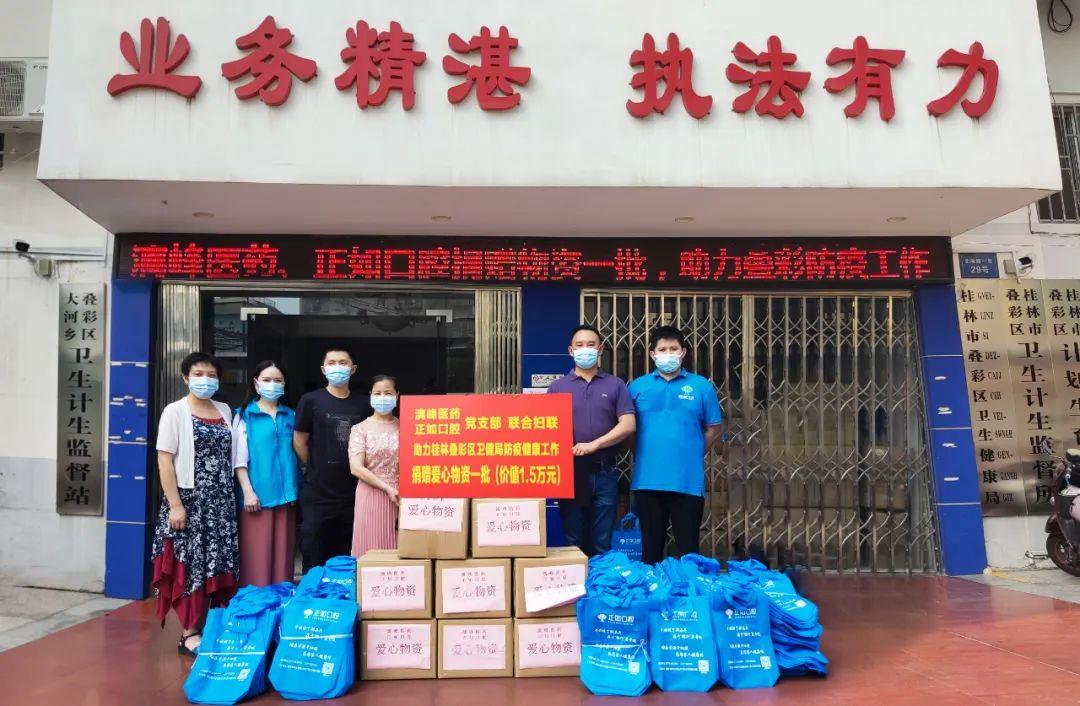 近期當地仍有零星疫情發生,桂林漓峰醫藥、正如口腔黨支部及時響應,籌措物品及抗疫物資,于7月15日攜手公司聯合婦聯向桂林市疊彩區衛監局捐贈防疫健康物資一批,總價值為15000元,助力當地政府做好疫情防控阻擊戰。