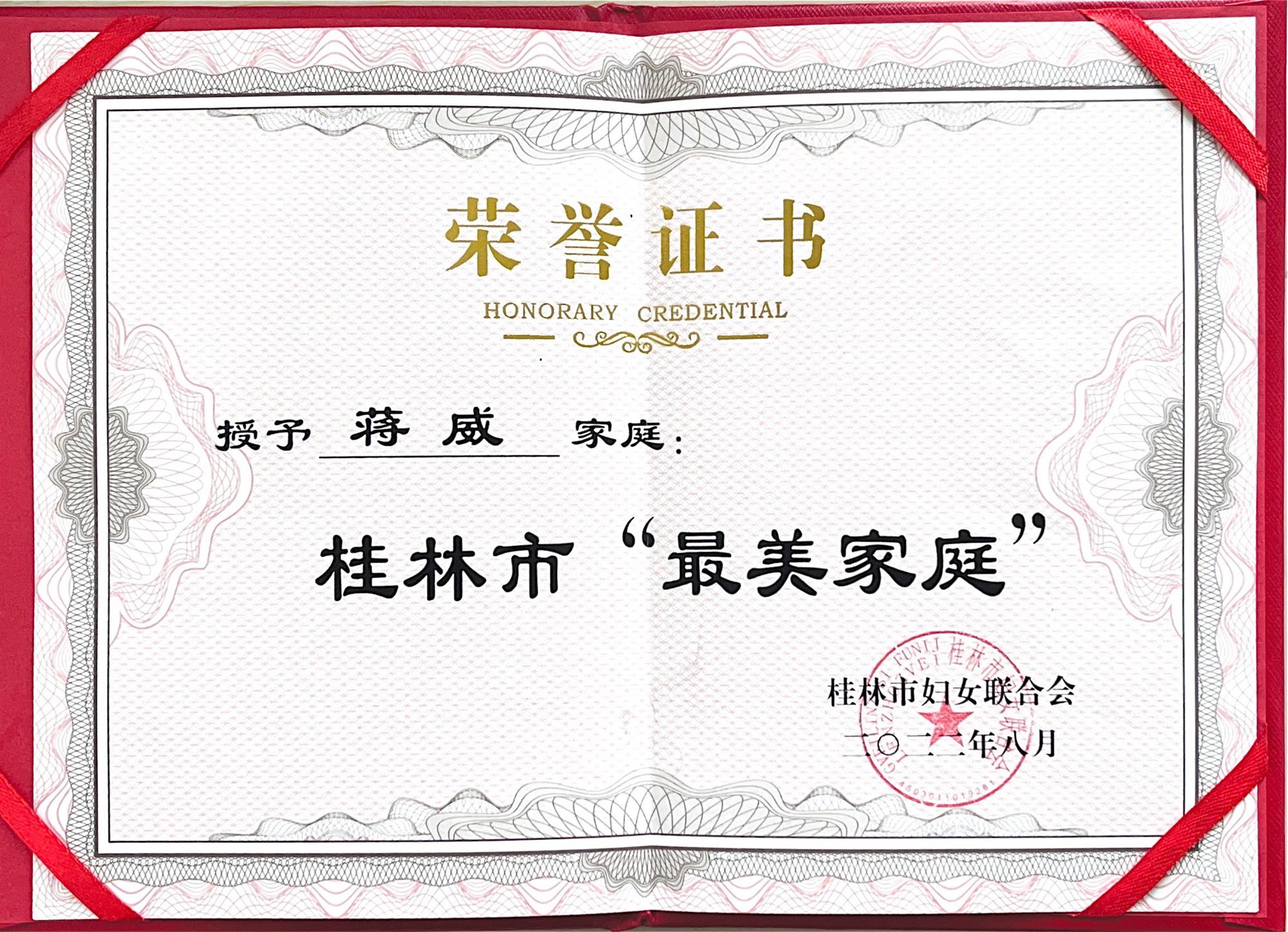 10月31日,桂林市婦聯主席 親自到桂林漓峰醫用給蔣威頒發了桂林市“最美家庭”榮譽證書